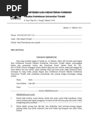 Contoh surat visum et repertum ver surat visum et repertum vr adalah sebuah surat yang secara resmi dikeluarkan oleh pihak tenaga ahli dokter forensik atau dokter perihal pemeriksaan yang dilakukan terhadap luka luka atau jenazah yang nantinya dalam surat ini akan dijelaskan sebuah kesimpulan yang mendeskripsikan bentuk jenis beratnya sebuah luka dalam sebuah. Susunan visum et repertum ada 5 bagian visum et repertum yaitu. Teknik pembuatan visum et repertum 41 daftar pustaka 61 lampiran 1. Identitas tempat pembuatan visum berdasarkan surat permohonan mengenai jam tanggal dan tempat.