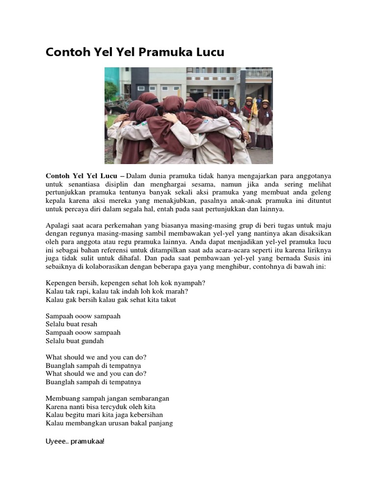 Contoh yel yel lucu. Reguku paling maju yes yes pinter pinter siswa nya reguku nomor satu regu melati nama nya. Contoh yel yel lucu dalam dunia pramuka tidak hanya mengajarkan para anggotanya untuk senantiasa disiplin dan menghargai sesama namun jika anda sering melihat pertunjukkan pramuka tentunya banyak sekali aksi pramuka yang membuat anda geleng kepala karena aksi mereka yang menakjubkan pasalnya anak anak pramuka ini dituntut untuk percaya diri dalam segala hal entah pada saat pertunjukkan. Contoh yel yel pramuka lucu. Biasanya contoh yel yel mos kreatif menggunakan nada lagu populer lain dengan mengganti lirik lagunya sesuai dengan kelompok. Dalam contoh ini menggunakan nada lagu pop dan lagu anak anak. Jika anda sedang dalam tugas untuk membuat yel yel untuk kelompok anda maka kumpulan contoh yel yel kelompok di bawah ini bisa anda gunakan.