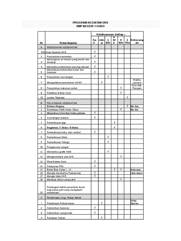 Melalui program uks diharapkan dapat. Penulisan program kerja tidak harus seperti contoh di atas. Program kerja atau rencana kerja untuk pembina uks usaha kesehatan sekolah yang biasanya diadakan di jenjang sd smp sma smk dinas pendidikan atau kemenag. Selain contoh program kerja uks disini saya sediakan administrasi penunjang program kerja uks yang di kemas dalam file doc microsoft word. File ini dalam bentuk format kosong silahkan ganti nama sekolah dan data siswanya disesuaikan dengan data bapak ibu. Jadi anda tidak perlu khawatir mendownload dan menggunakan file file ini di perangkat komputer anda.
