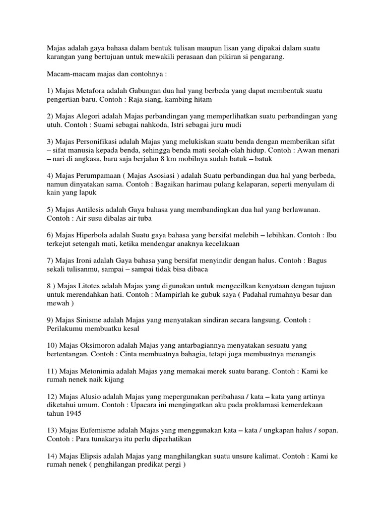 Di bawah ini akan kami paparkan semua informasi tentang jenis jenis majas. Secara garis besar macam macam majas ini dapat dibagi ke dalam empat kelompok besar meliputi. Jenis jenis majas jenis majas dan penjelasannya contoh admin kembali dengan jenis jenis majas. Pengertian majas secara umum merupakan salah satu gaya bahasa yang digunakan oleh seorang penulis untk mengungkapkan sebuah pesan secara imajinatif dan kias. Hal ini bertujuan membuat pembaca mendapat efek tertentu dari gaya bahasa tersebut yang cenderung ke arah emosional. Arti jenis jenis dan contoh majas lengkap pengertian majas dan macam macam majas artikel ini menjelaskan secara lengkap tentang pengertian majas atau gaya bahasa yang digunakan dalam karya sastra apa saja jenis jenis majas dan beberapa contoh gaya bahasa yang digunakan dalam bahasa indonesia.