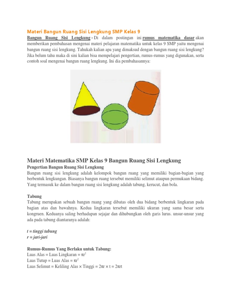 Macam macam rumus bangun ruang dan contoh soal bangun ruang pada kesempatan kali ini kita akan membahas macam macam rumus bangun ruang dilengkapi dengan contoh soalnya untuk lebih jelas silahkan simak ulasannya berikut ini. Dalam matematika terdapat beberapa bangun ruang salah satunya adalah tabungtabung merupakan bangun ruang yang dibatasi oleh dua sisi yang kongruen dan sejajar yang berbentuk lingkaran serta sebuah sisi lengkung. Rumus bangun datar matematika pengertian bangun datar dalam mata pelajaran matematika menurut imam roji adalah suatu bagian dari bidang datar yg telah dibatasi oleh garis garis lurus maupun lengkung sehingga bisa disimpulkan bahwa bangun datar ini merupakan bangun 2 dimensi yang hanya mempunyai panjang dan lebar dan telah dibatasi oleh garis lengkung dan garis lurus. Rumus kerucut pengertian unsur jenis dan rumus cara menghitung luas alas permukaan kerucut dan volume kerut serta contoh soal kerucut dan pembahasannya. Rumuscoid setelah sebelumnya kita membahas tentang rumus keliling tabung kali ini kita akan membahas materi tentang rumus keliling bangun ruang bola kita akan jabarkan secara detail dan lengkap dari pengertian bola pengertian permukaan bola sifat sifat rumus dan contoh soal dari keliling bangun ruang bola. Dan berikut ini adalah kumpulan soal bangun ruang lengkap plus kunci jawaban disertai file download yang bisa digunakan untuk latihan di rumah.